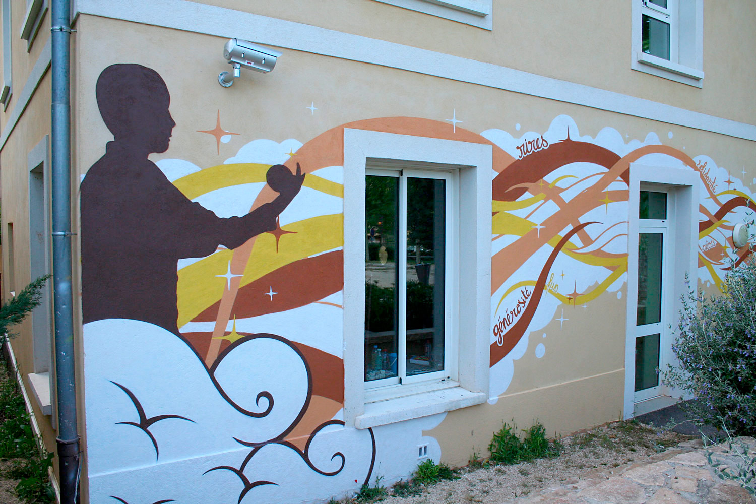 Une fresque participative où les utilisateurs du centre (toutes générations confondues) ont participé à donner leurs idées lors de consultations ouvertes au travers d’une boite à idée. La maquette a ensuite été élaborée en collaboration avec le conseil municipal, puis réalisée en atelier avec les enfants du centre, sur 4 jours pendant les vacances de Pâques 2011. La réussite de ce projet tient à l’engagement et à la bonne volonté de tous les acteurs, et nous remercions particulièrement les équipes de Monsieur le Maire Ange MUSSO, ainsi que celle de Fabien MOYNIER (directeur IFAC Revest) pour leur confiance et leur accueil chaleureux.