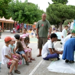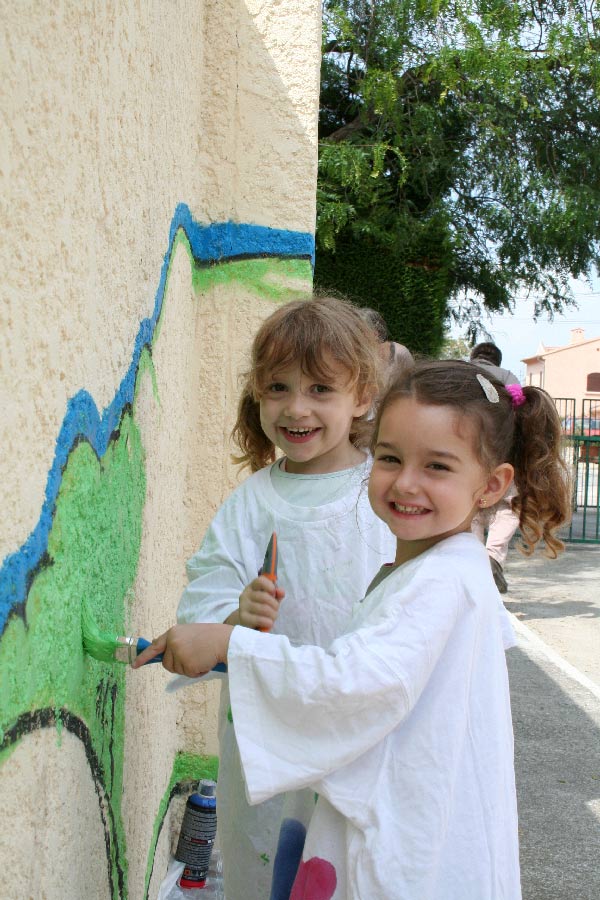 Dans le cadre du projet d’école 2008-2011, la réhabilitation de la cour était un axe de travail majeur ; Madame La Directrice, Viviane Syntes, et Monsieur le Maire, François de Canson, ont souhaité voir éclore une fresque pour clôturer artistiquement les efforts de tous. Il n’y avait qu’un pas pour faire de cette commande un moment de partage et de découverte pour les enfants, leurs parents et l’équipe enseignante. Ainsi tous ont été invités à mettre la main à la pâte sur deux journées d’atelier.